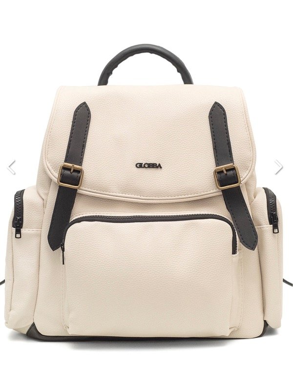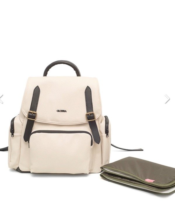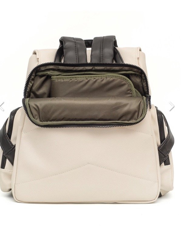 Mochila Maternal Jackie Crudo confeccionada en tela impermeable con detalles en cuero ecológico.