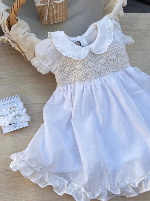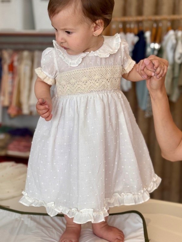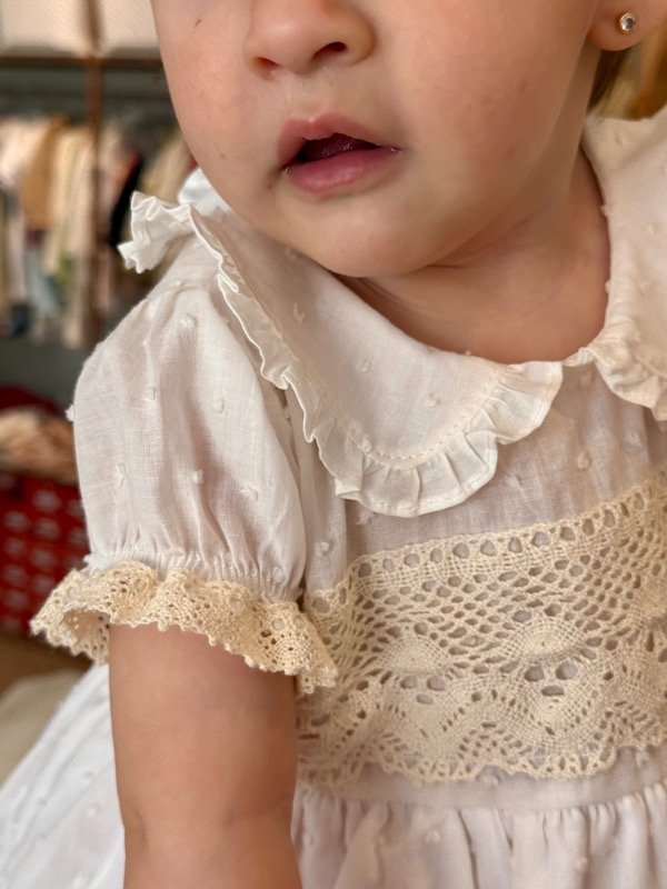 Manguitas princesa y terminaciones en puntillon y terminaciones de la falda voladitos, recorte en la cintura, botones de nácar, cinta bebé y aplique de la marca✨