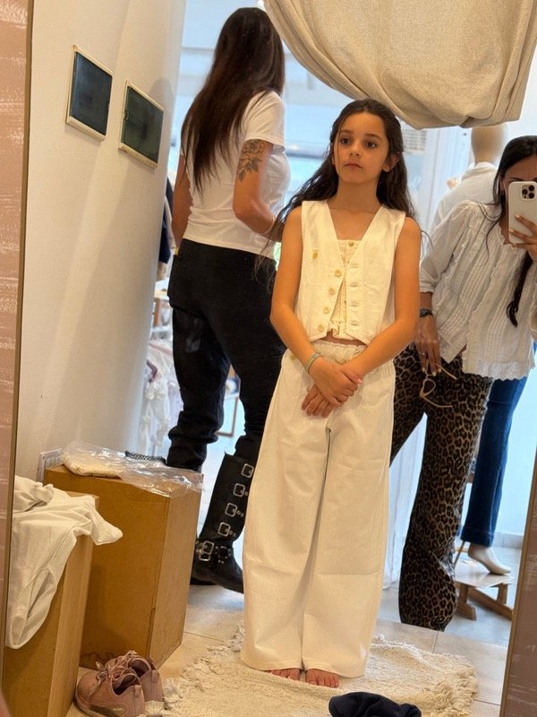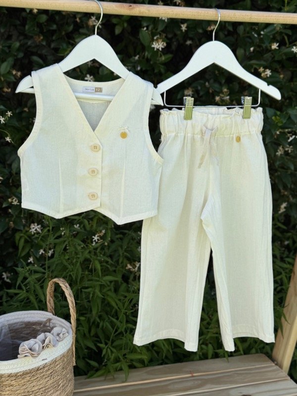 Chaleco Sastrero con recortes y detalle de moñitos y pantalones chacho con elástico en la cintura + cordón para adaptar a cada cuero!